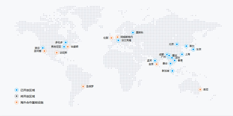 腾讯云在全球 25 个地理区域内运营着 53 个可用区;地理区域扩张是腾讯云全球化布局的首要任务,今年计划陆续上线多个区域和可用区,为更多企业和创业者提供集云计算、云数据、云运营于一体的全球云端服务体验
