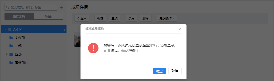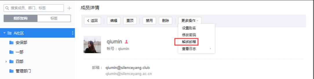 1、登录管理后台-通讯录,点击成员查看详情,点击更多操作-解绑邮箱。