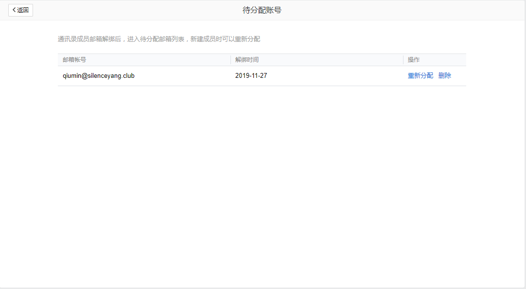 对于已绑定微信/手机的成员,管理员可以通过解绑邮箱功能,把邮箱重新分配给其他成员使用。 解绑邮箱功能还可以解决微信错绑问题。