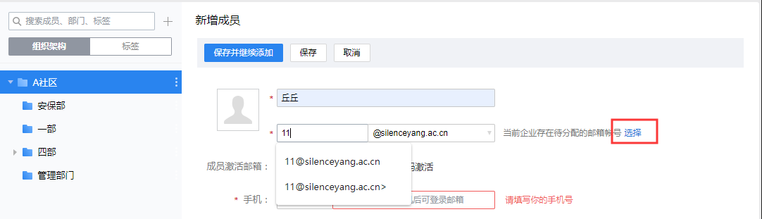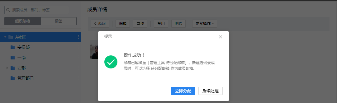 2、解绑邮箱后,通讯录-组织架构该成员显示禁用状态,再次编辑该成员时重新输入邮箱帐号,或从待分配列表邮箱中选择帐号并提交,即可重新启用。
